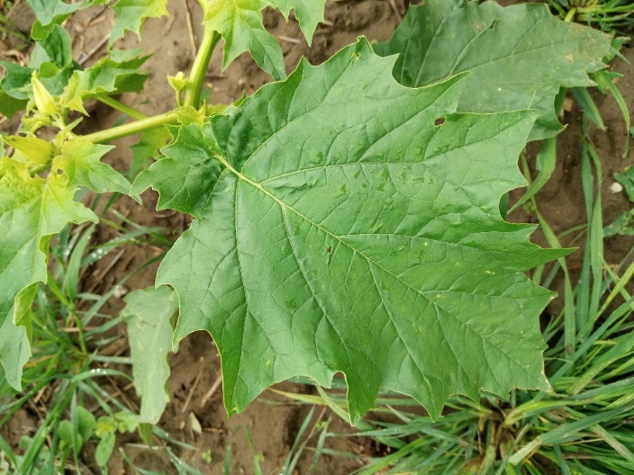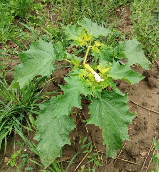Datura stramonium je jednoročná rastlina z čeľade ľuľkovité so stonkou vo forme byle, ktorá býva rozvetvená, lysá alebo len mierne pokrytá trichómami. Rozvetvené stonky sú rozľahlé, listnaté, silné, vzpriamené, hladké svetložltozelenej farby, opakovane sa rozvetvujú vidlovito. Listy sú chlpaté, veľké, jednoducho zubaté, oválne, lysé, žilky listov sú svetločierne, stopkaté, 10-15 cm dlhé, vajcovité a svetlozelené. Horná strana je tmavo-sivastozelená, zvyčajne hladká, spodná strana svetlejšia a po uschnutí jemne zvráskavená. Listy majú nepríjemný zápach. Rastlina dosahuje výšku približne jedného metra (0,3 – 1,2 m). D. stramonium vytvára lievikovité (rúrkovité), biele alebo fialovo sfarbené kvety (Obrázok 3). Kvety vyrastajú na krátkych stopkách z pazuchy listov. Priemerná dĺžka kvetu je približne 7,5 cm. Kalich je dlhý, trubicový a zakončený piatimi ostrými zubami (Soni a kol., 2012). Kvety kvitnú od júna do septembra, otvárajú sa najmä v podvečerných hodinách a bývajú opeľované nočnými motýľmi. Plody sú výrazné okrúhle, vzpriamené, suché, ostnaté tobolky s množstvom čiernohnedých semien obličkovitého tvaru (Obrázok 4) (Eftimová a Legáth, 2017).